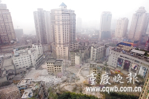 “轟!”昨天早上8點,伴隨著一聲巨響,江北觀音橋商圈渝北二村二號地塊的6棟居民樓瞬間倒塌,整個過程僅有1.5秒,絲毫未影響到周圍密集的居民區和各種管網。據悉,這是今年我市危舊房改造的第一爆,爆破原址將建200多米高五星級酒店,成為江北第一高樓。