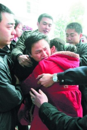 昨日下午4時05分左右,陰雨綿綿,在長沙市看守所,當犯罪嫌疑人唐斌被警方押出大門,其身懷六甲的妻子撲到他懷里痛苦失聲時,他流下了悔恨的淚水。