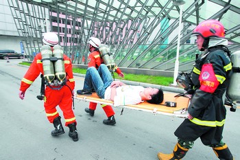 荷花園電信大樓高218米,共有地面建筑42層,是典型的超高層建筑。在昨日的演練中,最引人矚目的是高層供水加壓項(xiàng)目。“在高層建筑火災(zāi)中,當(dāng)消防戰(zhàn)士進(jìn)入火場時,難免會遇到室內(nèi)消火栓斷水的情況,這就要求我們必須有備用方案。”市消防支隊(duì)參謀長葛佳軍告訴記者,此次演練的主要內(nèi)容之一就是高空加壓。此次假設(shè)的起火點(diǎn)位于39層,在消防車的轟鳴聲中,水帶迅速充足,一條白色的水龍沖天而起!澳壳埃覀兊母呖占訅捍怪备叨瓤蛇_(dá)到280米左右。”葛佳軍說。(記者 千靈坡)