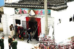 “愛紅棋牌室”西側(cè)緊挨古運河,在一條名為“缺口河?xùn)|小街”的巷子的最里面。記者在現(xiàn)場看到,“愛紅棋牌室”東、南、北3面道路周圍都被警方用2至3道警戒線封鎖,大量警力在現(xiàn)場維持秩序。由于圍觀群眾太多,躍進(jìn)橋上的警戒線出現(xiàn)了多次被人潮擠斷的情況,民警及時進(jìn)行修復(fù)和更換。