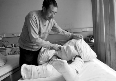 高煥東醫生告訴記者,小陳的腰1、2、4節椎體壓縮性骨折,左小腿粉碎性骨折,右足3、4、5節蹠骨骨折,右跟骨骨折,現在還在進一步治療恢復中。而小陳的父親告訴記者,目前已花了5萬多元錢,向親戚朋友借遍了錢,已經無力繼續治療了,只能提前出院。