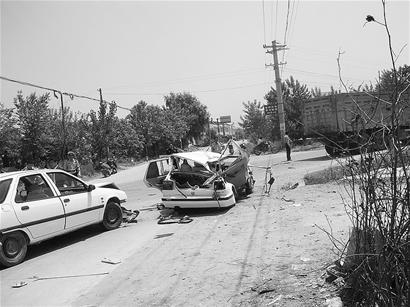 據附近廢品收購點的一位目擊者稱,昨日上午10點55分,106國道新(洲)徐(古)公路交叉處,一輛白色捷達小轎車沿新徐公路自東向西疾馳,與沿106國道由北而南駛來的一輛重型自卸貨車相撞。轎車右后側被撞后發生180度大旋轉,隨后又撞到路邊一輛停著的小車方才停下。據悉,捷達小轎車上有四男一女,司機鄭某受傷,兩男當場身亡,另一男一女被送往醫院,其中男子在送醫途中死亡。