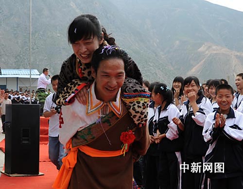 中新社隴南五月十日電 (唐明 劉啟舒)“春天的花兒多鮮艷,藍天的彩霞像錦緞,唱上一支心中的歌兒,獻給我們的支教老師,祝您生活幸福美滿……”五月八日,汶川地震重災區(qū)--甘肅文縣石雞壩中學的學生和老師跳起了歡樂的鍋莊舞,唱起心中的歌兒,為一對喜結(jié)良緣的新人祝福。