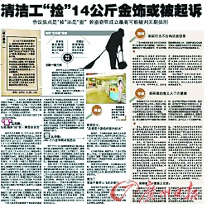 連日來,本報(廣州日報)率先報道的《清潔工“撿”14公斤金飾或被起訴》在社會上引起了極大爭論,尤其在法律界產生震動,中國律師網在網頁頭條討論該案,國內很多著名律師對該案發表了評論。