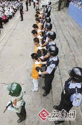 昨天下午1點30分,公判大會在富民縣鬧市區富民電影院門口準時召開,露天會場戒備森嚴,會場拉起警戒線,會場內外、周圍街道上站滿執勤民警,9名頭戴鋼盔荷槍實彈的民警、武警分別站在會場內維持秩序。