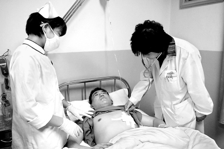 昨天晚上,記者聞訊后迅速趕到西京醫院,在急診科三樓的病房里,急診外科的醫生朱金文躺在病床上,他的左側胸部上貼著一大塊白色的紗布,胳膊扎著一根針管正在輸液。據目擊者說,下午4時許,一名五十多歲的病人在幾個人的陪同下來到急診外科就診,說是在交通事故中受了傷。醫生就開始給病人做檢查,可病人的手一直捂著胸部,拒絕檢查。此時,不知何因,病人打了醫生兩拳。醫生并未發火,隨后停下檢查,過了一會兒又過去查看病人。病人突然情緒失控,拿出一把小刀朝醫生胸部捅去,醫生趕緊用手壓住傷口跑到急救室。