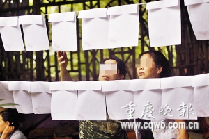 上午9時,沙坪公園春來茶樓,百余名老人圍著茶樓天井,在一張張相親牌上搜尋自己想要的伴侶。看到條件合適的人選,劉遠山掏出筆記下,一旁的紅娘趕緊過來幫他確認號碼是否正確。“您是今天歲數最大的老人家,讓我們來為您服務。”紅娘說。劉遠山笑著擺擺手:“用不著,我才80歲,還不老。”