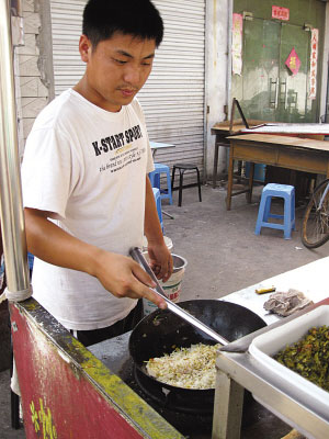 鮑斌是揚大體育學院03級學生,因為家庭經濟困難,讀大三的時候,小鮑決定休學創(chuàng)業(yè),選擇的創(chuàng)業(yè)項目是再普通不過的蛋炒飯。他沒有向父母透露半點風聲。在外面租了一間房子,開始了創(chuàng)業(yè)歷程。開始,小鮑的生意不是很景氣,后來,大伙對他的手藝認可后,生意便開始紅火起來。“我每天準備的炒飯都會比別人賣得快,所以經常早收攤,算下來,平均一天能賣幾百盒。”鮑斌一臉興奮地告訴記者,刨去成本、平常的開銷,每年掙10萬元非常輕松。因為生意越來越火,他給淮安老家的父親打了個電話,請二老過來幫忙。從此兩個老人正式給兒子打起“下手”來。