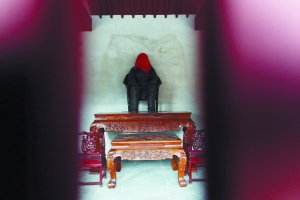 這座尚未完工的四合院風格祠堂,朱紅色的圍墻四周,花崗巖雕成的石欄環繞。院內東西廂房內分別擺設著整體浴缸和木質仿古雕木床。正房中擺放著一座3米高的銅像。
