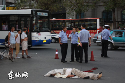 11日18時30分,記者在現場看到,死者頭部已被覆蓋,身旁有一灘長約一米的血跡。哈爾濱市交警支隊道里大隊已在現場處理相關事宜。據目擊者介紹,事故發生時間為16時40分許,一公交車在拐進站臺時,將一男子當場撞死。事發僅10分鐘,道里大隊的工作人員就趕到現場。