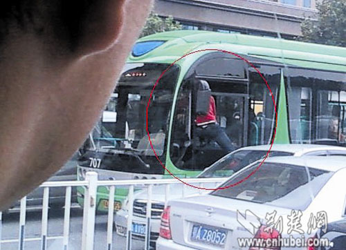 一名網友拍到了整個過程,并發到了網上,圖片顯示:一名穿紅色上衣的男子腳踩在一輛銀色轎車上,上半身鉆進公汽的駕駛室里,毆打公汽司機。該網友稱,被打的是707路公汽司機,公汽司機一直沒還手。