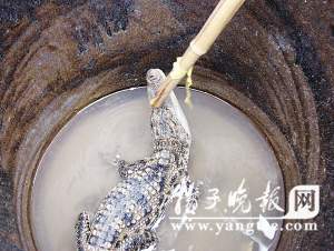 昨天上午,記者接到市民董先生的報料來到了江寧谷里孝義村111號,周國喜正蹲在一個大缸前,旁邊還有幾位村民在指指點點。記者走近一看,只見一只長約80厘米的小鱷魚正在缸底,頭部往上翹,尾部不停地甩動,看上去很緊張。盡管這條小鱷魚給周國喜帶來了不小的損失,可他沒有絲毫的恨意,反倒細心照顧起來。“這個魚塘我一直在養魚,每年2月份和6月份都投放一次魚苗,總共1萬多條,鳊魚、鯽魚都有。”周國喜說,可讓他奇怪的是,產量都不高。周國喜曾研究過多次,可沒有任何結果,這讓他百思不得其解。可就在今年8月份的時候,周國喜在清理魚塘時,突然發現一只小怪物伸出了頭,嘴巴長又尖。“就是它了,我當時確定魚塘產量不高就是因為這只小怪獸。”周國喜告訴記者,他自此開始盯著魚塘,可小怪獸很警惕,大都在魚塘底,很難發現。功夫不負有心人,通過近半個月的觀察,周國喜發現小怪獸喜歡上岸睡覺,不過是在對岸的水花生上面,很難捕捉。“尾巴很長,嘴很尖,身上顏色黃黑相間。”周國喜說第一眼看到小怪獸就覺得像是鱷魚,不過他不敢確認,于是喊來了弟弟,結果弟弟覺得像是國家一級保護動物揚子鱷。
