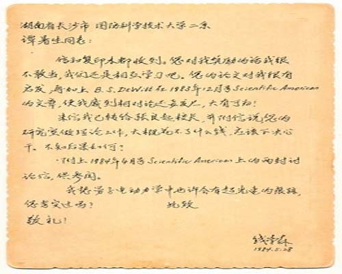 隨后,譚暑生每當(dāng)在學(xué)術(shù)研究過程中有什么新的進(jìn)展,或者遇到什么困惑,他都會(huì)寫信給錢學(xué)森,而錢學(xué)森基本上也會(huì)每信必回。為了讓譚暑生能潛心于科學(xué)研究工作,錢學(xué)森還多次給國防科大領(lǐng)導(dǎo)寫信,說“譚暑生的研究室做理論工作,大概花不了什么錢,應(yīng)該下決心干。”
