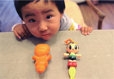 據楊女士介紹,上周末,她帶著2歲的女兒家奕到農村去采摘,“孩子牙還沒長齊,正好喂軟柿子吃”。在柿農為其采摘時,家奕在一旁往樹上看,“她用手指著,嘴里嘟囔著什么。”這個柿子被摘下來,柿農說它像人參果,就把它送給了家奕!盎貋淼穆飞希肄染鸵恢痹谕婺莻柿子,嘴里還是嘟囔著。”回到家,家奕拿出“鐵臂阿童木”的玩偶,楊女士才知道,原來,家奕一直在說那個柿子像“阿童木”。楊女士說,“這個‘柿子阿童木’都已經軟了,但是,如果放進冰箱凍起來,家奕玩不到就會哭的! (實習記者李川)