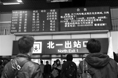 受10日以來石家莊暴雪影響,經京廣線進京的列車大面積晚點。昨天(11日),共有124趟進出北京西站的列車晚點,大量旅客的行程受到影響。為此,北京西站啟動應急響應,開放全部候車大廳,旅客可選擇全額退票。 昨天下午4點多,記者在北京西站進站大廳內看到,顯示屏上有17趟從西站始發(fā)的列車顯示為晚點,還有7趟列車未標明發(fā)車時間。在屏幕下方,滾動字幕顯示晚點列車信息。各個候車室外均增加了鐵路工作人員,負責維持秩序并做解釋工作。