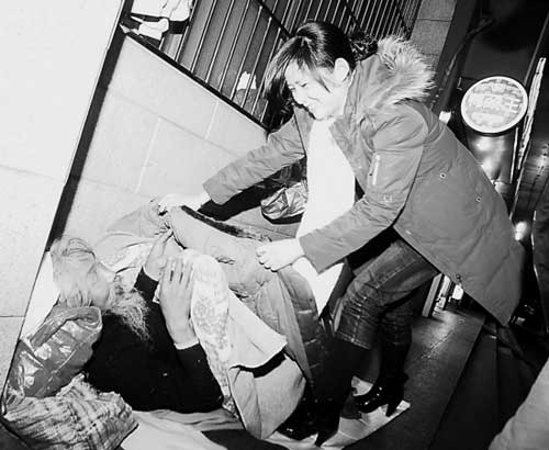 一旁,來自重慶的老顏和同伴蒙著頭,裹在一床棉被下,下面鋪著一塊大大的紙板。辛先生走過去,將棉大衣伸展開來,輕輕蓋在他們身上。