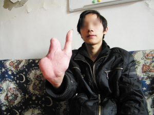 “我當(dāng)時(shí)疼極了!看到自己的4根手指已經(jīng)沒(méi)了,我心里特別害怕!”在這條生產(chǎn)線上工作的,都是小東的親屬。事發(fā)后,在舅姥爺?shù)膸ьI(lǐng)下,親屬們緊急將小東送到附近醫(yī)院。公司老板此時(shí)也得知了情況,并讓小東親屬將其轉(zhuǎn)到天津醫(yī)院進(jìn)行治療。在搶救期間,小東的親屬將找到的四根手指帶到了醫(yī)院。但因?yàn)槭种敢阉,而且粘上了很多橡膠,已經(jīng)無(wú)法進(jìn)行再植手術(shù)了。住院十余日后,小東出院了?粗皇O掳雮(gè)手掌的右手,小東多次掉下眼淚。