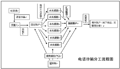 專案組確定該案是一個(gè)以境外人員為首的組織嚴(yán)密的犯罪團(tuán)伙所為。該團(tuán)伙通過(guò)網(wǎng)絡(luò)電話撥打事主電話,以事主家庭電話欠費(fèi)、銀行賬號(hào)涉嫌違法等為借口,騙取事主將賬戶內(nèi)的錢轉(zhuǎn)賬或提取現(xiàn)金后存入團(tuán)伙成員提供的“安全賬戶”內(nèi),并通過(guò)頻繁轉(zhuǎn)賬將賬戶內(nèi)的大額存款分散到多個(gè)賬戶內(nèi),其他成員則在全國(guó)各地分別提取現(xiàn)金。