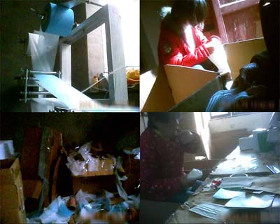 記者看到這里正在進(jìn)行包裝,在這個所謂的廠家里生產(chǎn)衛(wèi)生用品的工人們,沒有一個人穿著工作服,戴工作帽,包裝封口的機器,也是幾根木條定在一起,就湊合著用了,最出乎記者意料的,還不是這些簡陋的生產(chǎn)環(huán)境,而是包裝口罩的工人極不規(guī)范的動作,看到這個阿姨一邊蘸著唾沫一邊包裝口罩的手法,讓記者不禁為那些可能會戴上這包口罩的人感到擔(dān)心。