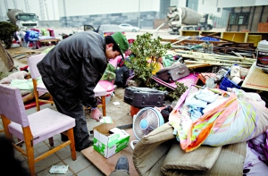 昨日上午9時(shí)許,百子灣家園東側(cè)空地上圍起警戒線。四五十名住戶不肯離去,身旁堆著鍋碗瓢盆、被褥、衣物等。“房子被拆了,晚上都不知住哪兒。”一位婦女坐在自家被褥上哭了起來。她懷中3歲女孩穿著單薄毛衣,凍得直流鼻涕。