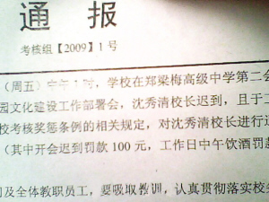 11日下午1時,淮安市漣水縣鄭梁梅高級中學開會,校長沈秀清因遲到且當日中午飲酒,被該校崗位獎懲考核組罰款600元,并通報批評。事情發生后,有網友將該校對沈校長的《通報》發到網上,一時間,網友對該通報的真實性及校長是以身作則、還是校方自我炒作提出質疑。