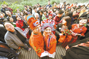 下午5時,巴國城公園涼亭,嗩吶鑼鼓齊鳴,來自美國堪薩斯州的新郎喬納森頭戴紗帽、身穿大紅官袍登場,重慶新娘徐閃鳳冠霞帔,臉頰微紅。新人亮相,親友陣陣歡呼,“洋婆婆”上前拉著兒媳婦的手,激動得不住地說:“You are beautiful girl(你是一個美麗的女孩)……”