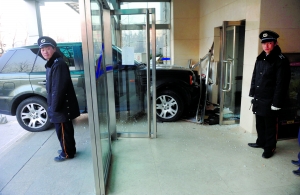 昨日下午4時許,京版信息港寫字樓前,一輛路虎越野車騎在大樓入口處,車身只有擦痕,四周散落著鋁合金框架和玻璃碎片,寫字樓大門已經被撞碎了一半。