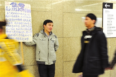 前天下午,大望路地鐵站通道里人流如織,凡經(jīng)過者或側(cè)目而視,或駐足觀讀海報(bào),再默默離開,有人大喊了聲“夠爺們兒”,但大多數(shù)人還是表示,挺有勇氣的,但不太能理解,征到的希望應(yīng)該不大。據(jù)阿坤說,整個(gè)下午只有一個(gè)中年阿姨留下了他的電話,但到截稿時(shí),對方也沒有聯(lián)系他。(記者陳婷)