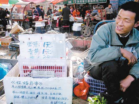 昨日下午,在位于南關(guān)路立交橋下,與寶雞市路燈管理處相對(duì)的攤位前,記者見(jiàn)到了正在賣(mài)菜的余東陽(yáng)。短發(fā)、濃眉、皮膚黝黑,笑容有點(diǎn)像《天下無(wú)賊》里的“傻根”,小伙子看上去的確像菜攤旁他的征婚啟事上介紹的那樣,“很普通,也不帥”,但一周來(lái),他已經(jīng)成了周圍菜販和很多買(mǎi)菜市民津津樂(lè)道的話題人物。