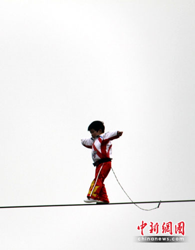 中新網常州3月30日電(記者 唐娟)30日,年僅3歲半的江西女童“小燕子”(藝名,原名張小燕),在江蘇常州淹城野生動物世界上演了一出老虎頭上空手走鋼絲的驚險絕技。在成功走了50米鋼絲后,“小燕子”所在的江西神童藝術團張團長宣布,三日后,“小燕子”將向百米發起挑戰,刷新紀錄,并申報“虎口空手走鋼絲”吉尼斯世界紀錄;同時,“小燕子”將在常州淹城野生動物世界設下一個月的擂臺,歡迎國內外各界人士前來挑戰,勝者當場懸賞100萬元。