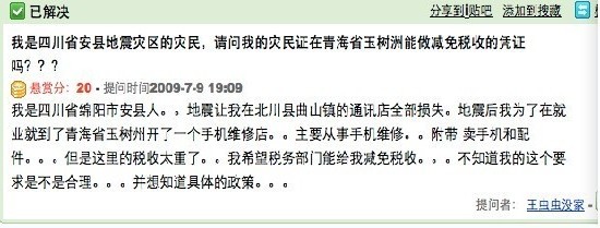 玉樹地震發生當日,一位名叫“王蟲蟲沒家”的網友,因為在去年7月百度知道上發出的一個帖子被人重新翻起,而成了數萬網友關注的焦點。這位網友曾經在北川開了一家手機維修店,5.12汶川大地震中北川被震毀,幸存下來的“王蟲蟲”在震后選擇到玉樹州重新創業,并想開一家手機維修店!巴跸x蟲”的這番遭遇,引起了網民的高度關注,“王蟲蟲”也被網友稱為最悲情的人物。因為“王蟲蟲”最后一次上網登錄的時間已是地震一個月前了,他(她)能否再次躲過這一次天災,成了眾多網友關注的焦點。四川在線記者在到達玉樹后不久,想盡辦法找尋這位網友。