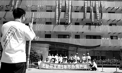 昨天上午,數十業主統一著裝聚在公寓大門前,并在樓前掛出橫幅,聲討開發商不給房產證等惡劣行徑。多名業主表示,他們是近幾年來陸續入住該公寓的,但都未獲得房產證,拉橫幅集體抗議實屬無奈。記者多次聯系開發商一方,均被告知不便回答或拒絕采訪。