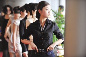 候場區,美女云集的地方,只要一個轉身,你就可以看見近千名佳麗有的在偷偷補妝,有的對著鏡子練習微笑。在等候面試的美女中,有帶著綠色美瞳的美國加州留學生,有穿背帶褲剛剛高中畢業的學生,還有身著職業裝想換個工作的公司白領。“現在工作不好找,所以只要有招聘就來試試咯。”這是記者在現場聽到最多的一句話。