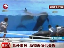 海洋館里海豚表演失誤"倒栽蔥"式跌出水池