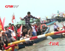 【解說詞】記者在現場看到,插著鮮艷的紅旗,鏗鏘有力的鼓聲,整齊的劃槳動作,盲人代表隊并不遜色于其他的龍舟代表隊。隨著鼓手的節奏,盲人隊員奮力劃動船槳,鼓手,舵手,盲人隊員和志愿者配合得都很默契。