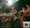 24日中午,記者在現場看到救援人員正在緊張的作業。救援人員正準備下井架鋪設排水管道,有礦車在現場運輸排水管道。另一邊的排水管道,正在從井下往外排水。