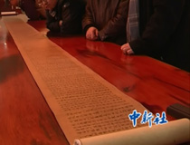 【解說】狂草書法家李克仁是太原市文聯名譽主席,也是這幅作品的作者,他舞動著一支長2米、重30公斤的巨幅毛筆,在30米長、10米寬的宣紙上筆走龍蛇,一揮而就。