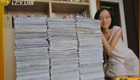 女生考前與高中三年考卷合影