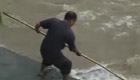 市民腳踩洪水忙捕魚