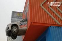 長春一輛汽車“沖出”集裝箱 懸停半空