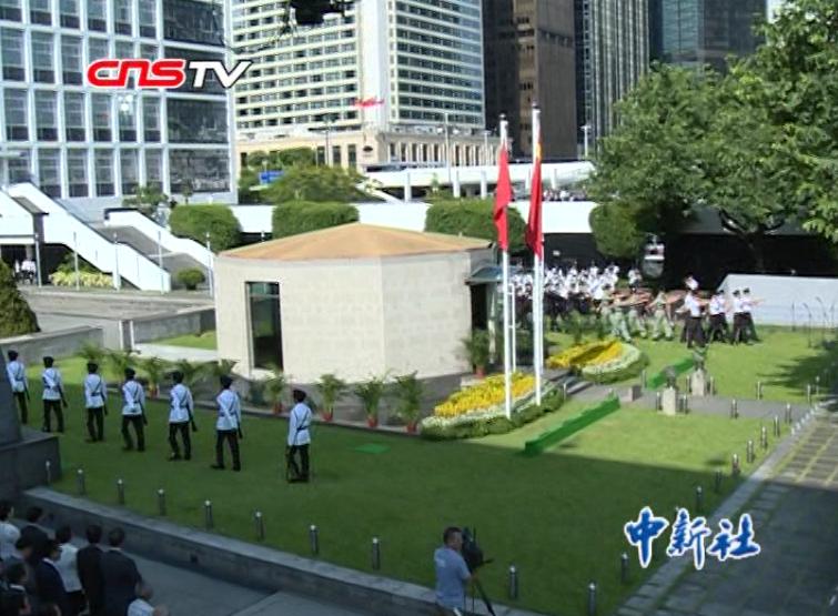 【解說】當日上午,香港特別行政區政府在大會堂紀念花園舉行官方儀式,紀念中國人民抗日戰爭勝利。。香港警察步槍儀仗隊舉起步槍,鳴21響,向所有為抗戰勝利做出貢獻的人致敬。