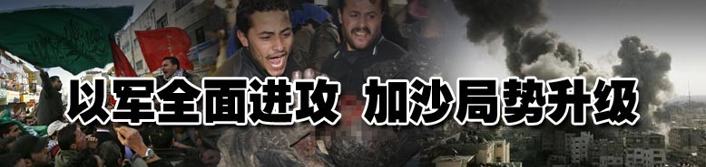 第十三日 以軍8日對至少25個目標進行了打擊,并襲擊了巴勒斯坦武裝人員的5個分隊。同時,以軍還在停火時段內(nèi)襲擊了聯(lián)合國救援車隊,造成兩死一傷,遭到各方譴責(zé)。以色列軍方稱,當天有4枚來自黎巴嫩方向的火箭襲擊了以色列北部城鎮(zhèn)Nahariya,5人輕傷。黎巴嫩政府官員表示正調(diào)查此事。目前,軍事打擊已造成至少765名巴勒斯坦人死亡,超過3120人受傷,另外,以色列總理奧爾默特還暗示,攻勢可能擴大。【詳細】