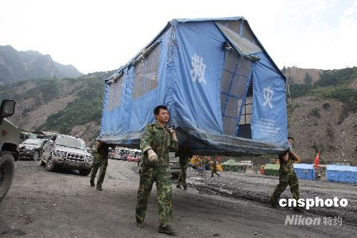 ·圖:鐵軍官兵搬遷帳篷準備重建新映秀(6月21日 15:04)