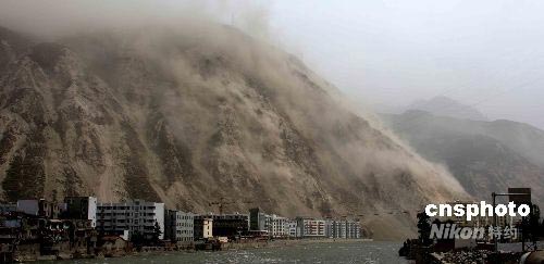 ·圖:山體滑坡煙塵籠罩下的汶川縣城(6月4日 09:51)