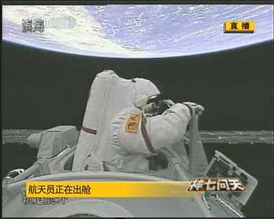 ·圖:“神七”航天員翟志剛走出艙外開(kāi)始實(shí)施出艙活動(dòng)(9月27日 16:46)