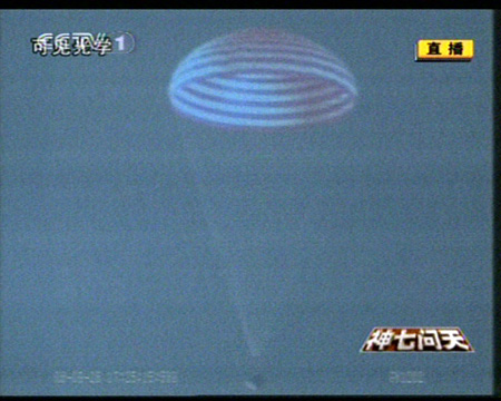 ·圖:神舟七號(hào)飛船返回艙主降落傘打開(kāi)(9月28日 17:30)