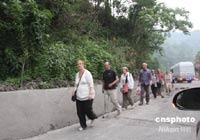 道路中斷 中外游客徒步向都江堰方向前行