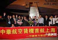 兩岸首班專案貨運包機——臺灣“中華航空公司”CI六九○一航班于二00六年七月二十日凌晨零時三十三分飛抵上海浦東機場。該首航貨機于十九日晚間在臺灣桃園機場起飛,歷經二個半小時航程,抵達上海,機型采用波音七四七—四○○型全貨機。該專案貨機的航線,與此前兩岸春節客運包機的航線相一致,由于仍需繞道飛經香港航管區上空,因此尚非真正意義上的兩岸直航。據了解,本次專案貨運包機搭載的是在滬辦廠的臺商為擴大產能而托運的機械設備和相關器材。業內人士分析,兩岸貨運包機的實現,一定程度上能夠滿足臺商特別是高科技廠商在大陸投資的實際需求,有利于提升這些企業在國際市場上的競爭力。與此同時,這也是兩岸空中通航在原有基礎上又邁出的新一步。<點擊進入組圖> <詳細報道>