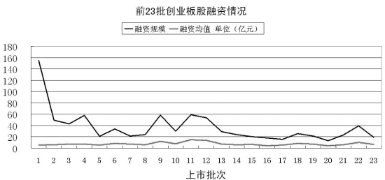 從融資規(guī)模看,前23批已上市的120只創(chuàng)業(yè)板股首發(fā)合計融資854.62億元,平均每股首發(fā)募資7.12億元。其中,首批28股合計融資154.78億元,居各批次之首;4月30日上市的第11批4股合計融資59.30億元緊隨其后;第9批、第4批及第12批創(chuàng)業(yè)板股首發(fā)融資額皆在50億元以上;而8月25日上市的第20批3股僅合計融資12.86億元,規(guī)模最小。
