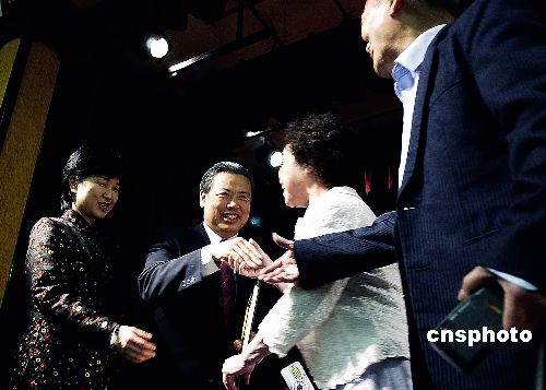圖為彭克玉(中)和夫人楊京梅在迎候華人華僑。